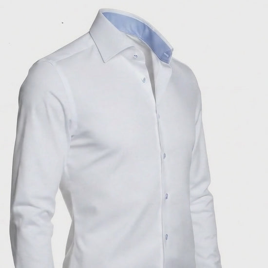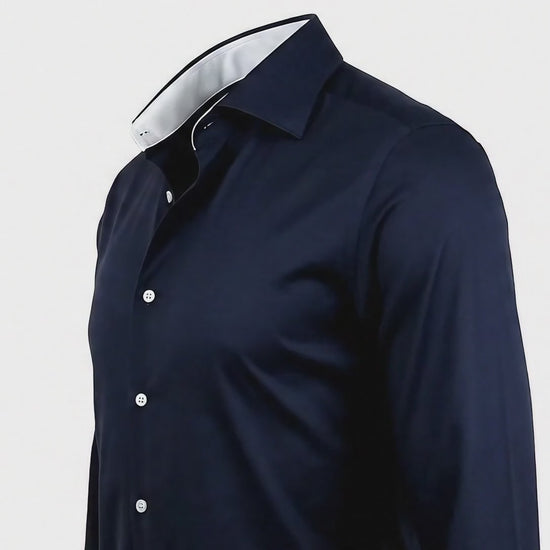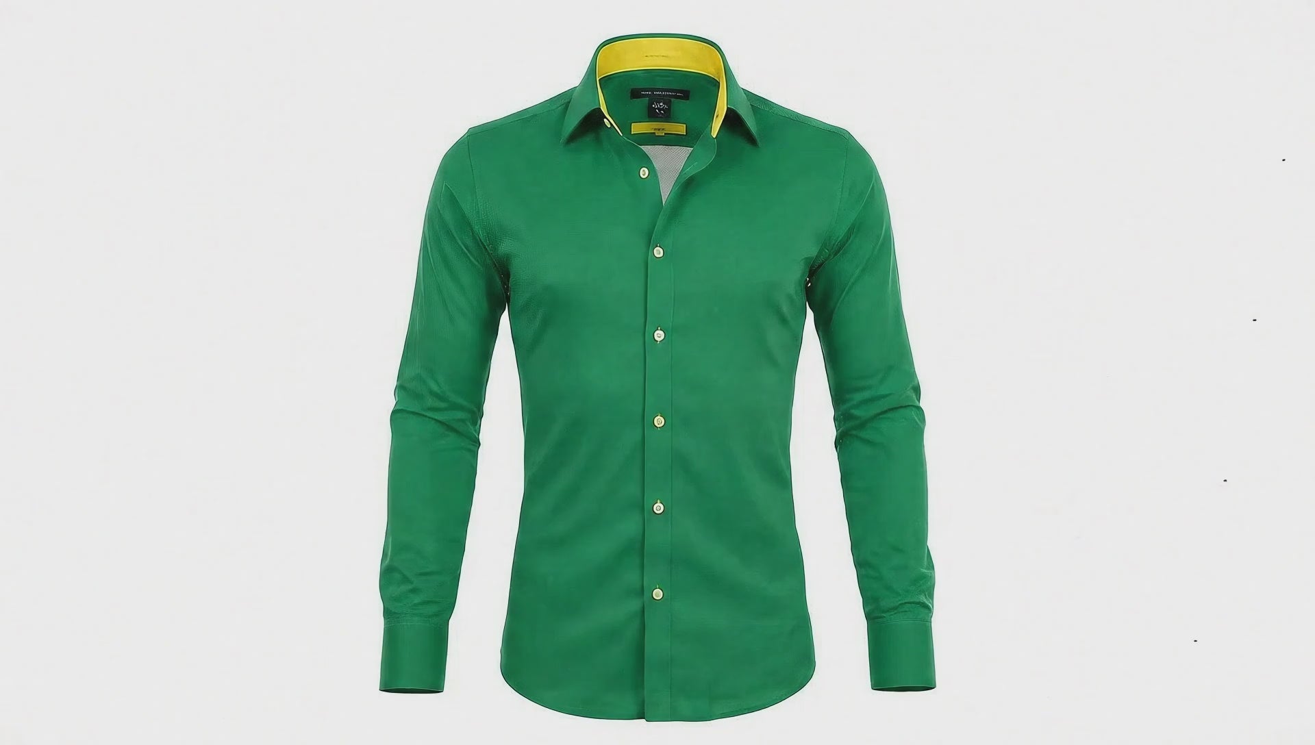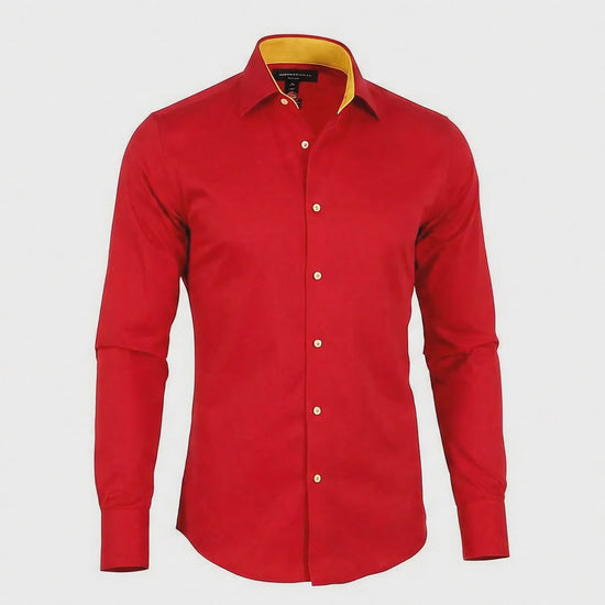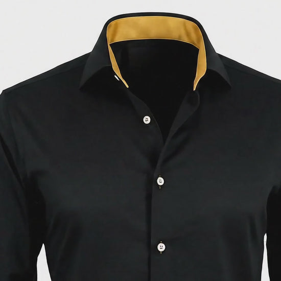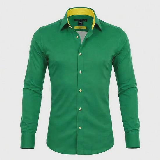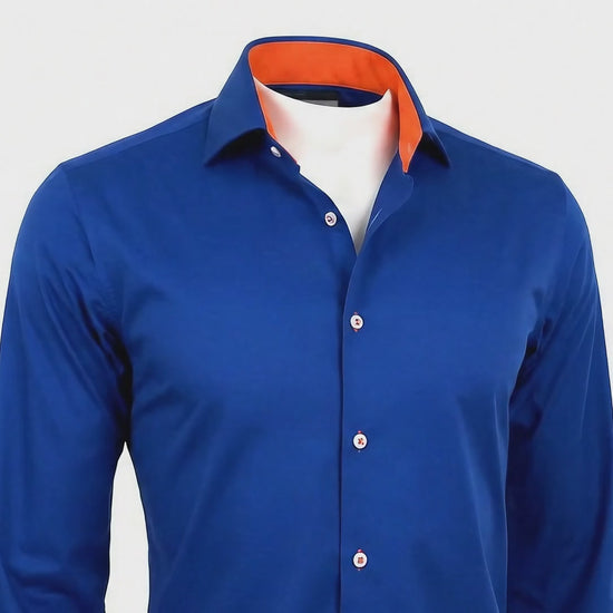 A modern men’s dress shirt designed in a vibrantly coloured bamboo, with sharp detailing contrasts. Our Game Day Shirts feature a spread collar lined with accent colours of your choosing on the inner band and collar stand, creating a striking pop of colour whether worn open or buttoned. The inside of the cuffs, placket lining, buttonholes, and sleeve gauntlets are also finished in the accent colour, allowing for a stylish rolled-sleeve or open-cuff look.